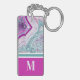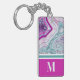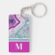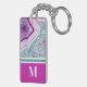 Stilfull Teal Magenta Rosa Agatsten Monogram Nyckelring. Agatkristaller och geoder fortsätter att vara en populär trend! Denna tryckning har en närbild av en teal eller turkos och lila rosa eller fuchsia geodsten, komplett med små kristaller och vit bandning. Accenterad med livfull färgblockering för att ge den en modern och trendig look. Lägg till din initial för att göra den till din egen.