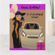 Det här kortet visar en stilfull afroamerikansk kvinna som bär en svart klänning, hatt, glasögon, medan hon står bredvid en champagnebil. Skaffa det här söta kortet till din vän, släkting eller kollega.