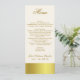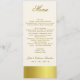 Elegant mager meny för bord för bröllopmottagande som göras i elfenben, med diagram av det goldtone musikbandet längs grunden och att täcka baksidaen. Beställnings- text som göras i en guld- brunt, är klar att personifiera för ditt bröllopmottagande. Älskvärt tillägg till vår stilfulla goldtone bröllopuppsättning.