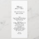 Long och mager bröllopbordmeny som göras i vit, med diagram av en dela sig, upptill. Personifiera alla text för att passa din meny för bröllopmottagandet. Älskvärt tillägg till ditt bröllopmottagande.