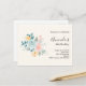 Födelsedagsinbjudan med en söt akvarellillustration. En blomsterbukett med rosa och blå blommor omgiven av gröna blad och kvistar.