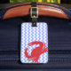 Rolig bagagemärkre för stilfull sommar som göras i ett moderiktigt sparremönster för blått och för vit. Bekläda av märkren har en dämpad röd kulör silhouette av en krabba, och baksidaen har ett rött textområde för cirkulär, på det vänstert. Vittext är klar att personifiera. Underbar för bagage och mer.