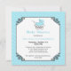 Chic fyrkantig baby shower inbjudan, med en vintage känsla, gjord i ett ljust blått och vitt prickmönster, med grafik av mörkgrå ornamental ramad vit fyrkantig textyta. En vintage stil ljust blå barnvagn dekorerar toppen av textområdet. Anpassa texten för din baby shower. Matchande pappers tallrikar, servetter och frimärken finns tillgängliga.