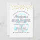 En inbjudan till en sjuksköterskeexamenfirande. Designad med falska guldconfettiprickar längs överkanten. Ett pastellblått stetoskop bakom partytxten.