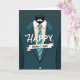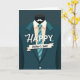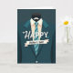 Designad med en minimalistisk grafisk stil centrerar kortet kring en snyggt skräddarsydd kavaj, skjorta med krage och randig slips, vilket ger en polerad fadersdagslook 👔. Kostymen är en djup petrolblå färg mot en dyster tealbakgrund, vilket får den ljusare skjortan att sticka ut som en mjuk höjdpunkt. En krämfärgad skjorta sitter under kavajen, och slipsen löper diagonalt med ränder i akvamarin och djupare teal, vilket ger en lugn rytm till designen. Mjuk skuggning mellan lagren skapar en effekt som påminner om klippt papper, vilken känns öm och nära, som en tyst nick av uppskattning från en person till en annan 👨. Strax ovanför kragen svävar en liten vit mustasch på plats, vilket antyder en vänlig och tillmötesgående pappaföreställning. Ordet “HAPPY” visas nära toppen i vita
