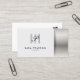 Det här stilist-affärskortet har en silver-dämpad bakgrund i elegant på kortets höger. Monogrammet brev visas i ett elegant-skriptteckensnitt över en enkel silver-bakgrund med kvadratiska bokstäver. Ditt namn och din titel ljuger under monogrammet brev, över en svartvit färgad bakgrund. Perfekt för mode, skönhet, dam, kvinnor, konstnärliga kosmetiska produkter, sammansatta teman.