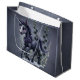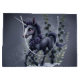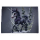 Stiliserad enhörning i blommigt. Den här teckningen skildrar en stiliserad enmajs med mörk grått päls och ett silver horn. Lila ro sörjde nacke och huvud och skapade en elegant, prestigefylld aura. Stora, uttrycksfulla lila ögon och ett milt leende ger motivet en vänlig och inspirerande beröring. Bakgrunden med stiliserade mörk blått blommor och grönt skapar en drömmande blommigt.