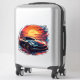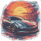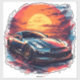Konstnärlig avbildning av en strömlinjeformad tävlingsbil, målad med livfulla mönster, mot en stiliserad solstrålning bakgrund, frammanande fart, kraft och dynamisk visuell energi, perfekt för teman om bilars estetik.