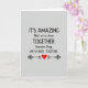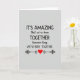 This funny greeting card shares a thoughtful message about togetherness in a warm, meaningful way. Centered on a soft light gray background, the text reads, “IT’S AMAZING that we’ve been TOGETHER however long WE’VE BEEN TOGETHER.” The words “AMAZING” and “TOGETHER” stand out in large black block letters, while the rest of the sentence is written in a gentler black script that feels personal and sincere. The layout leaves plenty of open space, making the message easy to read and unhurried. Beneath the text, a black scroll design stretches outward on both sides, guiding your eye to a small red heart in the center ❤️. The heart adds a quiet pop of color and a clear note of affection. This card feels thoughtful and flexible, making it a great choice for couples or close friends, no matter how long you’ve shared your story