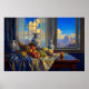 A richly detailed still life unfolds across a sunlit table, where fresh fruit, delicate ceramics, and softly draped fabric are illuminated by warm, glowing light. Beyond the open window, distant mountain peaks rise beneath a brilliant blue sky, creating a striking contrast between the intimate interior and the expansive landscape beyond. This piece blends elegance and atmosphere, capturing a timeless moment of beauty, light, and quiet refinement.
