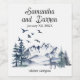 De romantiska vin-flaska-märkningarna har en vattenfärgsbild i nordvästra stil Stilla havet. En bild av rocky mountains som täcks av snö visas i avstånd. En manlig hjort bildas nära fronten, som står bland en skog i gräs träd. En flock fåglar strandar över träd. Det är perfekt för en utomhusvistelse bröllop, vinterbröllop, vår eller vilken säsong som helst.