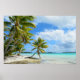 Poster utskrift av en hängande handflatan träd på en vit sandstrand på en liten ökö i den blå lagunen av tropiska Rangiroa, en atoll nära Bora Bora i Tahiti skärgårds Fransk Polynesia i Stilla havet.