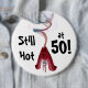 Den Customisable åldern, roligt knäppas/emblem för en speciell födelsedag med den röda stiletten skor konst med dekorativt röker design