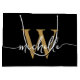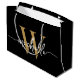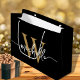 Tjejigt Styligt Modernt Elegant Svart och Guld Monogram Initial Namn Script Anpassad Personlig Presentpåse. Denna design har ett förnamn i en snygg handskriven svansfont med kalligrafi (eller typografi) med monograminitial i guld och vitt på svart bakgrund. Lätt att anpassa den. Denna feminina presentpåse är bra som hus-inredningspresent, även för födelsedag, bröllop, 16-årsfest, mors dag, brudvisning, baby shower, som present vid examensfest och den är för tjejen som älskar trendiga unika saker.