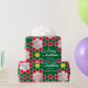 Roligt ljusa julfamiljsfoton som omger presenten pappert i röda, grönt och vita nyanser. Anpassa med dina tre speciella familjefotografier, familjens namn eller ditt meddelande. För närvarande läser man God jul från Rodríguez-familjen. Designad av Sarah Trett.