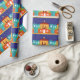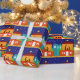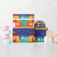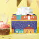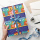 En modern stildesign för folk konst med en färgrik stad av Bethlehem. En silhouette av den heliga familjen med Joseph och Mary som förbiser bebiset Jesus i mangeren. Aftonhimmlen är en härlig mörk - slösa med stjärnan av det östliga glänsande över. Mindre stjärnor omger himmlen.