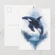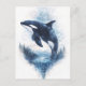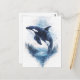 Det här fantastiska vykortet visar en majestätisk späckhuggare som hoppar graciöst mot en krispig vit bakgrund. Valens kropp är vackert återgiven med djupa indigo-akvarellstrukturer och fylld med en skimrande galax av vita stjärnor. Nedanför späckhuggaren framträder ett lugnt landskap från mjuka blåa akvarellfläckar med en tät städsegrön skog och snötäckta bergstoppar. Små fåglar driver genom den luftiga, dimfyllda himlen och fullbordar denna magiska och fridfulla naturscen. Det här vykortet är ett idealiskt val för att skicka ett inspirerande meddelande, en genomtänkt lapp till en entusiast för marint liv eller som en minimalistisk, naturinspirerad väggdekoration.