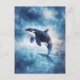 Detta eteriska vykort visar en majestätisk späckhuggare som bryter ytan graciöst genom en drömlik, himmelskt blå atmosfär. Späckhuggarens kropp är vackert återgiven med djupa indigo- och marinblå akvarellstrukturer som tycks smälta samman med det stora kosmos. Ovanför virvlar en livfull teal- och indigofärgad galax fylld med lysande skimrande stjärnor och vitt stjärnstoft. Den nedre halvan av scenen visar en dimmig blå havsyta som reflekterar ljuset från nebulosorna ovanför. Det luftiga, magiska ljuset och de mjukt suddiga strukturerna skapar en kraftfull känsla av förundran och kosmisk skönhet. Detta vykort är ett idealiskt val för att skicka