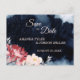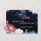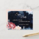 Detta Spara datum-postkort för stjärnklara blomsterbröllop inspirerar till antingen ett midnattssommar-tema eller ett mörkt vintersnö-tema, vilket gör det till en säsongsanpassad design. Det marinblå, nästan svarta, akvarellmåleriet med en himmel fylld av himlakroppar eller snöflingor, i kombination med den minimala rosa blomsterutsmyckningen och kalligrafin, kommer säkert att uttrycka magin i er äktenskapsfirande, oavsett tid på året.