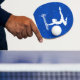 Den roliga gymnastiska designen som presenterar en tumblingflicka med henne händer som planteras på ord GYMNASTIK och, tänder - blåttstjärnor på en mörk - slösar bakgrund.