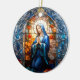 "Bygga upp den tidlösa skönheten i tron med vårt "fastmagnade glas av Jungfru Mary" keramiska prydnadsföremål. Med inspiration av nedfläckad glasfönsters invecklade konst har denna design ett figur i blåraster, händer som är präglat av bön och som ställs mot en livfull bakgrund av blommönstren"