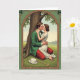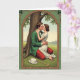 Designed with an Art Nouveau-style arch frame trimmed in deep green shamrocks, this St. Patrick’s Day card sets a quiet, romantic scene. Beneath a tall tree on a grassy hill, a couple leans into a close kiss, his arm snug around her waist as her fingers rest lightly on his shoulder. He wears an emerald jacket with red trousers, and she stands barefoot in a flowing white dress, her hair neatly arranged as she tilts toward him. Off to the side, a white boater hat and a slim walking stick lie on the grass like they were set down in a hurry. Soft, misty light washes over rolling green hills and faint buildings in the distance, giving the moment a gentle, private feel 💚. The greeting text sits near the top inside the arch in green lettering, with a smaller line below it in a matching tone, surrounded by Celtic-style details ☘️. The border is filled with curling leaf shapes and clustered shamrocks, framing the couple under the tree trunk at center.