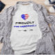 Hjärta med en amerikansk flagga som är bäst i designen. "stolt" står under texten med fet, svart typsnitt, med "Pro-Democracy" skriven under texten i fet, blå brev. Under det är en liten svart stjärna med linjer på vardera sidan. Finns i manar eller i storlek på kvinnor och stilar.