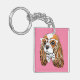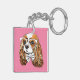 Denna design presenterar ett porträtt av en stolt Spaniel för kung som Charles ha på sig exponeringsglas och en fluga på en rosa bakgrund.
