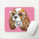 Denna design presenterar ett porträtt av en stolt Spaniel för kung som Charles ha på sig exponeringsglas och en fluga på en rosa bakgrund.