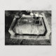 Svartvit fotografi av ett japanskt stenbäcken och vatten-kuppor. Dessa förekommer vanligtvis i japanska trädgårdar, i tempel och i helgedomar.