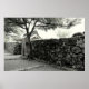 Nostalgiskt svart och vitt fotografi av en mullig stenvägg med en takbeklädd japansk grind under ett spridande träd. Fotografiet togs på Kyotomålet.