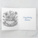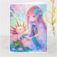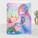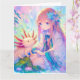 Ett stort födelsedagskort för en flicka med färgsida på insidan. Söt rosa, blå och lila animerad tjej med blomma i håret som leker med en axolotl.