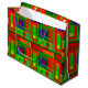Stor, färglös julklapp med rött, grönt, guld och blått.