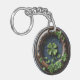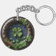 Cirkulär detalj med en stor fyrklöver omgiven av mindre klöver, mot en texturerad blå bakgrund. Den cirkulära ramen har ett vintage, metalliskt utseende med en väderbiten finish, vilket skapar en harmonisk blandning av natur och konstnärskap.