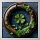 Cirkulär detalj med en stor fyrklöver omgiven av mindre klöver, mot en texturerad blå bakgrund. Den cirkulära ramen har ett vintage, metalliskt utseende med en väderbiten finish, vilket skapar en harmonisk blandning av natur och konstnärskap.