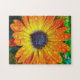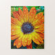 Med en nära och personlig blick på en guldblomma av gult-orange med en subtil och träffande blå omgiven av grönt löv blad under.
