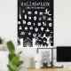 Halloween-affisch med nedräkning. Exemplet är en stor design på 30x40 tum med 31 kalenderdagar som du kan stryka eller markera allt eftersom dagarna går under oktober. Med olika illustrationer, inklusive spindlar, kranier, katter, häxkvastar, drycker, ljus, fladdermöss, trollkittlar, spöken, en kyrkogård och ett skrämmande träd med ansikte.