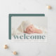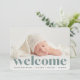 En söt och elegant förlossningsannonsering som innehåller ett vågrät eller ett landskapsinriktat foto med "välkomstpålägg" som täcker över texten. Din baby namn och födelsestatistik visas under svart. Lägg till ytterligare tre fyrkantiga foton i baksidan, tillsammans med ett personligt meddelande.