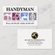 Utformningen har fyra stora ikoner logotyper nära mitten. De representerar några av de tjänster som ni kan erbjuda. Över överst på kortet finns den överdimensionerade jobbtiteln "HANDYMAN" som du kan byta till kostym för dina egna tjänstebehov. Under logotypens skylt finns en lista över arbete som du kan erbjuda. Du kan ändra den här listan till kostym efter dina behov. Överst uppe finns en guld hammare-logotyp som du kan använda. Detta följs av företaget namn, dess kontaktuppgifter och ett slogantaggradalternativ. Detta kort skulle vara underbart för handyman, byggare och entreprenörer att få använda.
