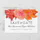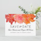 Orange hibiscus spara datum bröllopsannonsering för ett hawaiianskt tropiskt tema äktenskap. Tre exotiska hibiskusblommor i mörkt rosa, ljust rosa och orange bildar en bred kant längst upp på vita kort med svart text med utrymme för att inkludera parets fullständiga namn.