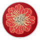 Knabb i en stor, röd, kamelliablomma, i ett Art nouveau inspirerat stil, på en djup röd bakgrund
