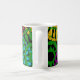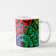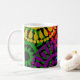 Mugg har en svart historikdesign av stora cirklar som bildas av regndroppar och cirklar i rött, gult, lila, grönt och turkos.