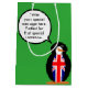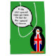 Designdetaljer visar Faster Skos Ms. Pingvin iförd en väst med flaggan för Storbritannien. Ändra bakgrundsfärgen så att den passar din personliga smak eller festtema. Ändra orden i Ms. Pingvins pratbubbla till vad du vill. Låt Ms. Pingvin hjälpa dig att fira med en medelstor presentpåse.