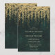 En illustration av träd grenar med lush, vild grey och hängande lövning, som är digitalt lagrad med guld, över en glittrande framväxande grönt bakgrund, dekorerar den här vår sommarbröllopsinbjudan med ett förändrad skogstema. En elegant, en modern inbjudan till ett sagolikt bröllop, det är perfektens bröllopsinbjudan för brider som kärlek den sagoartade skogsmiljön, älvskogen eller trädgårdsområdet och framväxande grönt.