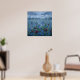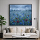 Artwork of a field of flowers in a rain storm. Embrace the beautiful melancholy of a summer storm. Heavy streaks of rain blur the distant village, pulling the focus to the vibrant foreground. Here, deep red roses and delicate bluebells stand tall against the grey, stormy sky, their colors glowing intensely in the low light. It is a visual reminder of beauty persisting through the storm. This art features a mix of blue cornflowers, drooping bluebells, and deep red roses. The background shows a grey, cloudy sky and a faint silhouette of a town, all obscured by many streaks of rain. Perfect for rain lovers or anyone who wants to add some moody nature to their home decor.