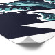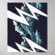 En fetstilt grafik som har ett starkt hav vinkarare i skalade tårar, turkos och djupblått, kontrasterad med vassa, vita blixtblixtar som skär över en mörk marin bakgrund. Den dynamiska sammansättningen förenar vätskan rörelse vid kraschen av vinkart med blixtens ojämna intensitet och skapar en dramatisk och energisk syn som fångar naturens råa kraft.
