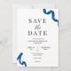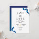 Modern och elegant sparar inbjudan med ett guld-saxpars och en blå perfekt för produktresuméer, nya företag, party och liknande tillfälle.