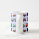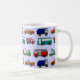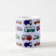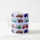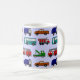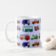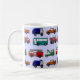 Mugg har en novelty av lastbilar och buss i rött, blått, grönt och brunt på en fält av ljusblått.