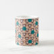 Mugg har en geometrisk design som upprepar bruna och bruna trianglar med turkocirklar överst på en fält av benvita. Vill du ha samma design i olika färg? Säg det.
