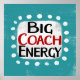 "Big Coach Energy" är en söt textdesign i blått med svart och röd text, tillsammans med en vit accent-form och vita texturerade vita punkter runt den.